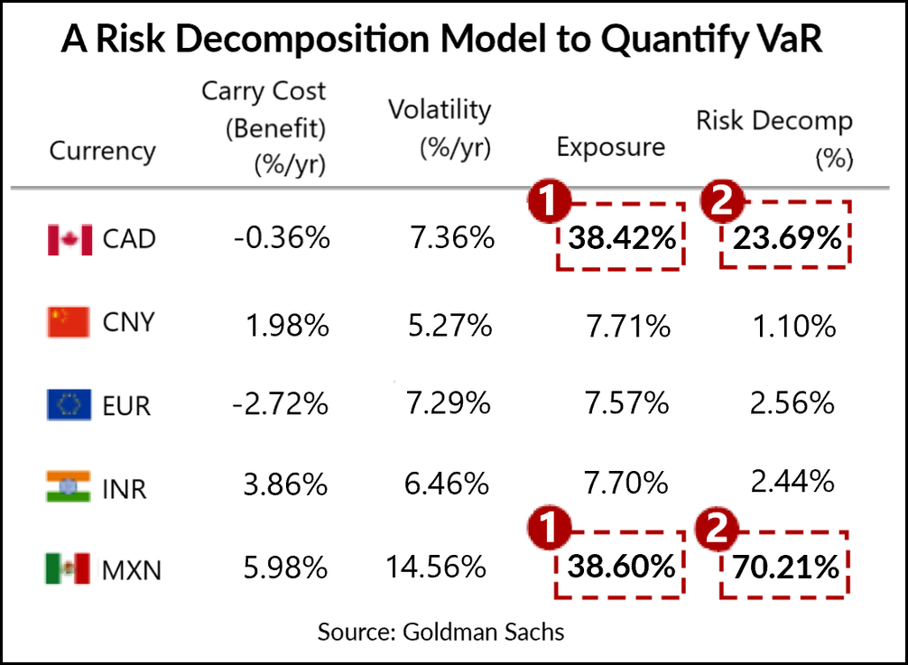 • As the table above shows, the Canadian dollar (CAD) and the Mexican peso (MXN) contribute the largest amount of risk on an individual basis to a sample portfolio. See the figures marked 1.
