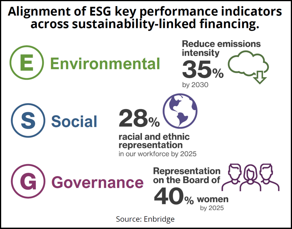 E, S and G. Enbridge wanted to highlight its commitment across E, S and G in its SLB framework, so it included a KPI from each of the three major components of its published ESG goals: