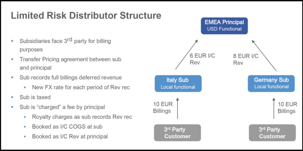 After: forecasting complexity. In the LRD structure, a taxable local-currency functional subsidiary is now the seller to the third-party customer. The billed amount is booked as deferred revenue at the subsidiary level instead, and local currency-denominated royalties are intercompany cost of goods sold (COGS) for the sub (see graphic).