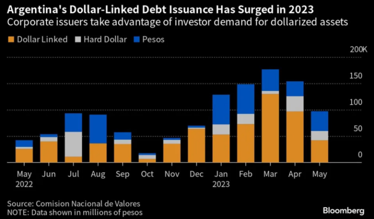 - As Bloomberg recently noted (see chart below), Argentine companies in industries including energy and telecom have taken advantage of demand by investors for dollar-linked assets, using the opportunity to issue low-rate debt to refinance or raise new capital.