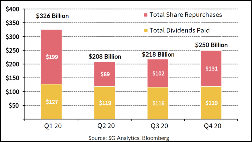 - An increasing number of companies have restarted their buyback programs and more are expected to follow suit through the rest of 2021. As of mid-May, S&P 500 companies had repurchased $156 billion in the first quarter, with 90% of the data reported, according to S&P.