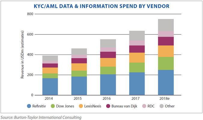 The current size of the AML/KYC market is about $750 million and growing, according Burton-Taylor, an international consulting firm. The market includes not just AML/KYC, but also services relating to financial crime and compliance activities. And it is “a major area for budget increases,” with estimated global spending projected to grow 18.3% in 2018, Burton-Taylor says, generating an estimated five-year compound annual growth rate of 17.5%.