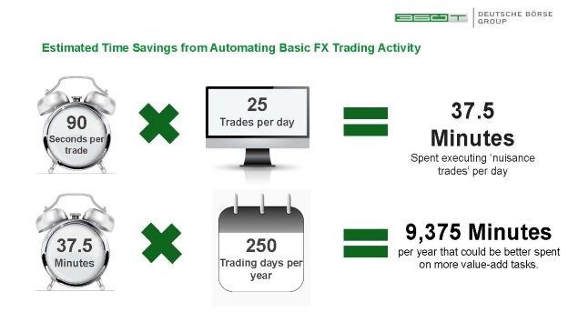 • The time savings accrue by eliminating the need to manually enter orders onto trading platforms, examine the pricing offered, choose among competing banks (and sometimes talking to them on the phone) and then deal with all the required back-office chores involved.