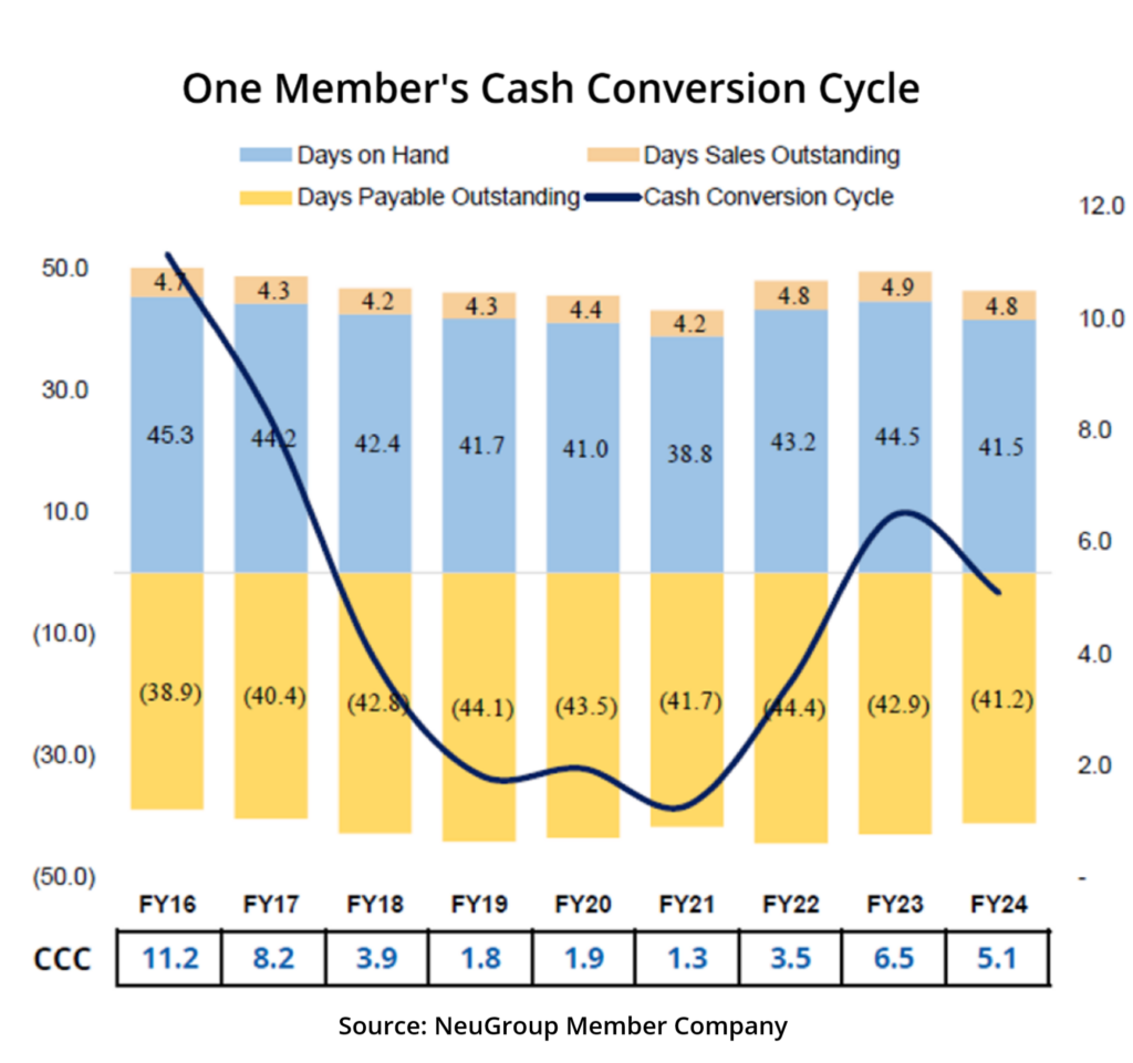 - The shift involved fostering stronger relationships with procurement, which handled renegotiations with suppliers, and granting fewer exceptions. As a result, the cash conversion cycle improved to 5.1 average days in the most recent fiscal year, from 6.5 the year before (see chart below).