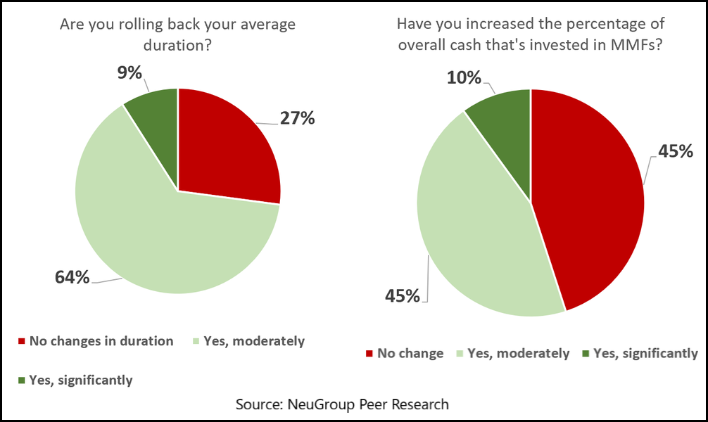 This is the most uncertain time I’ve ever seen,” said a representative of Allspring Global Investments at the fall meeting of NeuGroup for Cash Investment 2, aptly capturing the sentiment of many members. Uncertainty and a sense that interest rates will keep rising despite fears of recession are among the reasons many of them are keeping average portfolio duration short amid the extreme inversion of the yield curve. They’re viewing cash as a useful asset and steering clear of longer-term investments that—for now—aren’t worth the extra risk. - This spring, a NeuGroup survey showed that 70% of members did not intend to extend duration. At the fall meeting sponsored by Allspring, a poll (results below) showed almost three-quarters are shortening duration and 55% are increasing the percentage of cash held in money market funds.