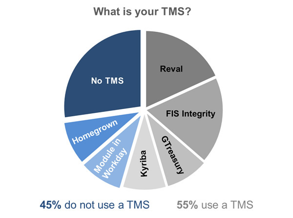 The COVID-19 crisis has highlighted the value of technology that allows treasury to know—in real time—how much cash is available and where it is. A recent virtual meeting of NeuGroup’s Tech20HG—for treasurers of high-growth tech companies—revealed that the technology that treasury teams use varies: The pre-meting survey of members showed that 45% of respondents do not have a treasury management system (TMS), compared to 55% that do.Those with a TMS use well-known vendors, but no clear winner emerged (see pie chart). With the relative youth of the companies in the group, their ERPs are of recent vintage and acquisitions haven’t yet resulted in the use of multiple ERPs and/or multiple instances of the ERPs in use. From that point of view, things are under control.