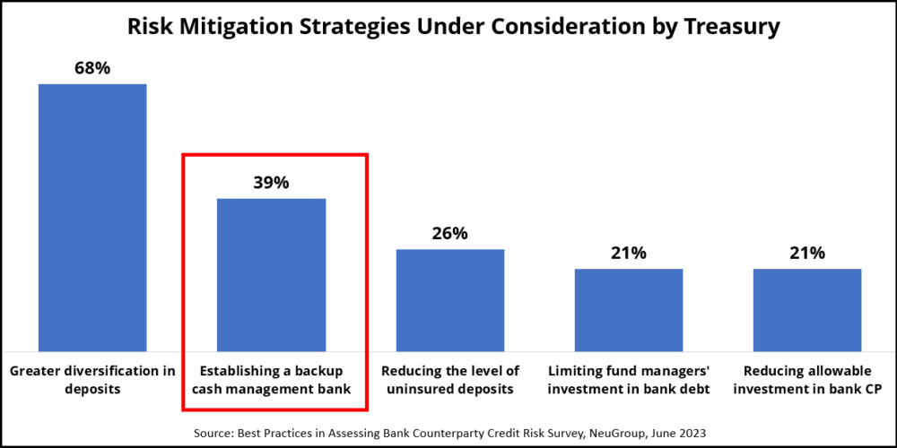 Thirty-nine percent of respondents to NeuGroup’s Best Practices in Assessing Bank Counterparty Credit Risk Survey reported they are considering establishing a backup cash management bank to mitigate operational risk in case of a bank failure or a meaningful decline in credit quality (see chart). That’s a significant percentage because a corporate’s relationship with its cash management bank is very sticky. Switching banks is complicated and extremely time-consuming, involving the creation of a new account structure as well as transitioning pooling and sweeping arrangements.