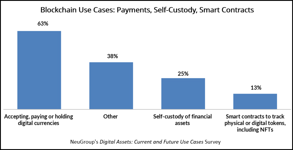 Self-custody. The next most common use case, at 25%, is direct custody of digital assets, primarily because members are concerned about the steady deterioration in the creditworthiness of current counterparties. Because regulatory oversight of this new asset class is in the early stages of development, third parties have often been the providers of custodial depository accounts. - One member at a so-called “crypto-native” company with a business model based exclusively on use of blockchain technologies said his company mostly uses self-custody, not external custodians. “Self-custody makes it a lot easier to do payments to vendors, and even invest to diversify our portfolio,” he said.