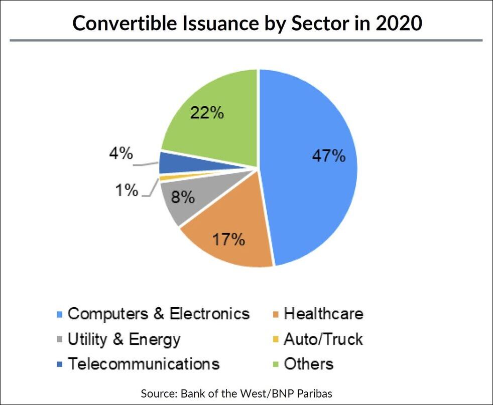 Cool convertibles. The US convertible bond market hit near-record issuance levels in 2020, reaching over $100 billion, with tech companies issuing nearly half of all convertible debt (see below).