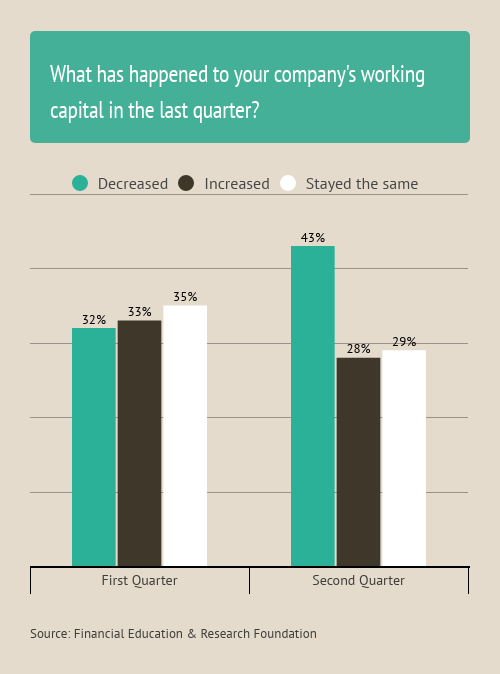 Working capital blues. Nearly half of respondents, 43%, said their companies’ working capital balances decreased in Q2, compared to 33% in Q1.