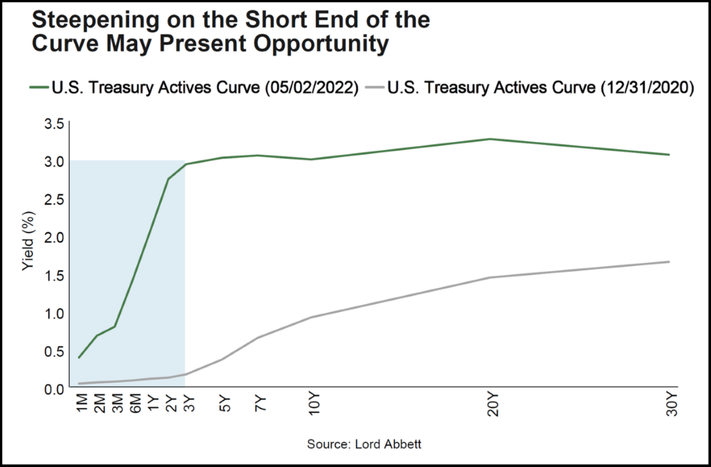 • Lord Abbett presented the chart above comparing the performance of actively-traded US Treasuries from 2020 and now. Because the yield curve is steep through the first three years, then flattens out, short-term (one to three-year) securities make sense right now, particularly in light of uncertainty around the persistence of inflation, noted Mr. Graham.