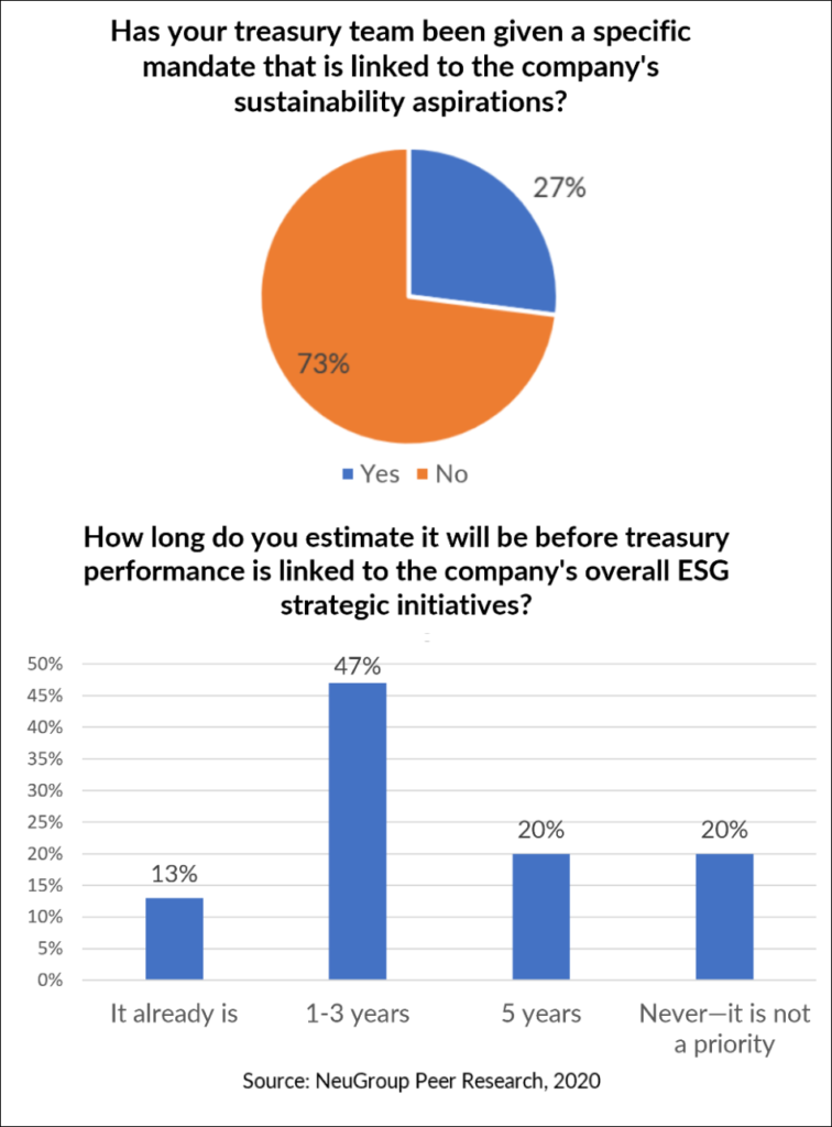 A poll at the meeting revealed the low percentage of companies that have given treasury a specific sustainability mandate or have linked ESG to performance (see below).