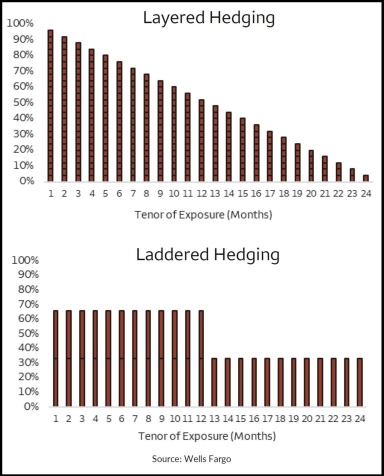 Another way. Laddering, by contrast, means hedging a higher percentage of the exposure earlier and for longer per hedge, i.e., “more notional but less frequently” or “sort of an infrequent layering program,” as Wells Fargo’s presenter put it.