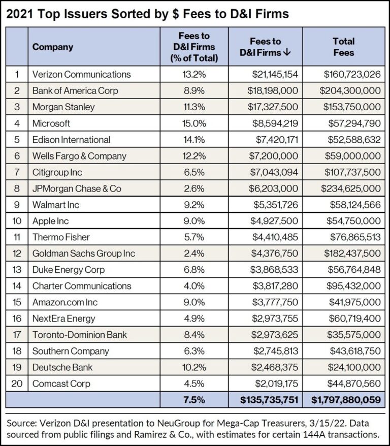 Verizon treasurer Scott Krohn this week presented data to his peers in NeuGroup for Mega-Cap Treasurers showing the top 20 issuers of investment grade (IG) debt ranked by the fees they paid in 2021 to banks and brokerage firms owned by women, Blacks, Latinos and veterans—so-called diversity and inclusion or D&I firms. Verizon is a recognized leader among corporates that have committed to giving more business to D&I firms in the past several years. More importantly, Verizon and some other companies are giving the firms more meaningful roles, including in green bond deals where Verizon has elevated some D&I banks from being co-managers to serving as active joint book runners.