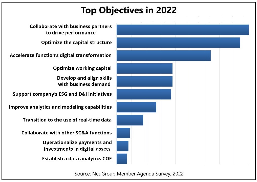 Treasurers at the world’s leading companies are doubling down on their commitments to expand beyond traditional areas like liquidity management and spend more time in strategic zones. That’s among the key takeaways from the January 2022 NeuGroup Members Agenda Survey. In it, respondents picked their top three objectives from a list of 11. Their answers, shown in the chart above, reveal an emphasis on driving better enterprise financial performance.