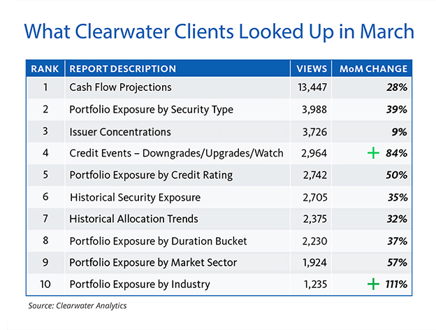 Cash flow and credit. It may not be surprising, but relative to other searches, the sheer number of views in March of data on cash flow projections for securities and portfolios—more than 13,000—captures exactly what was the top concern of nearly every portfolio manager.