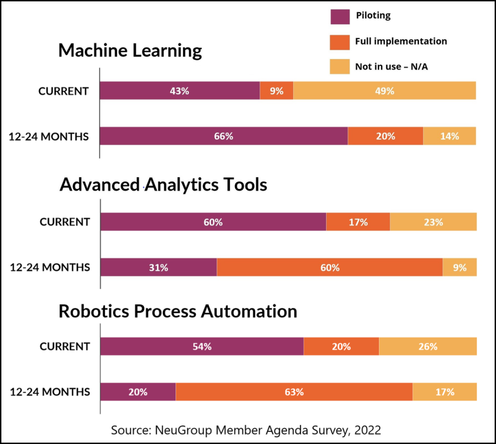 A road to harmony. The charts above show the high percentage of finance organizations—including but not limited to treasury—that in one to two years plan to pilot or implement machine learning (86%), advanced analytic tools (91%) and RPA (83%). “What’s happening is that finance is adopting all these different technologies,” Ms. Essaides said. And one school of thought is that treasury can harmonize better with the broader finance org by borrowing its instruments.