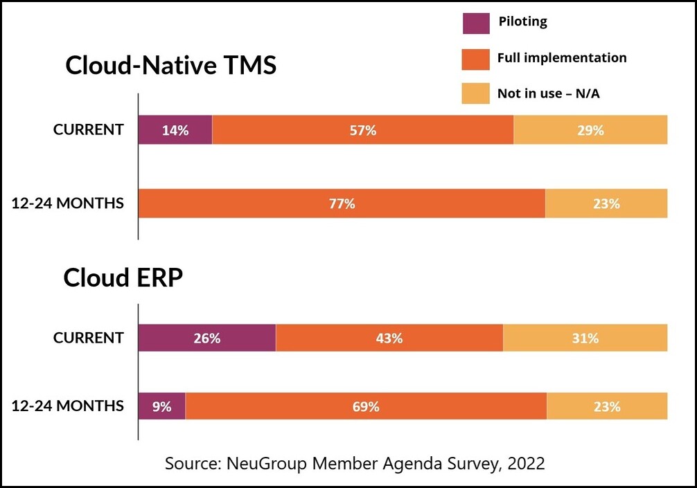 - And as the charts below show, 77% of respondents said they will have fully implemented a cloud-native TMS in the next year or two. Meanwhile, 78% of broader finance organizations expect to be implementing or piloting cloud-based ERPs in that time frame. Call that alignment.