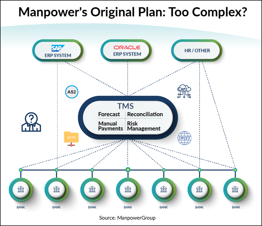 A manpower problem. For ManpowerGroup, automated bank connectivity was a primary objective. The company operates in 75 countries and provides work for over 600,000 employees—a sizable operation for a central treasury team with only a handful of members.