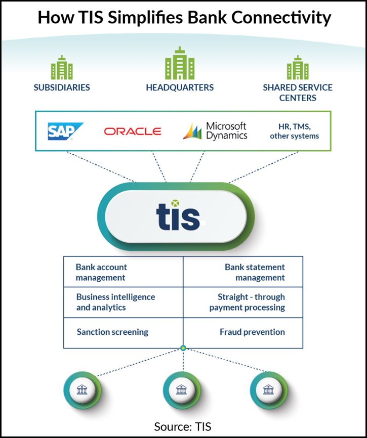 • As the graphic below shows, TIS sits between a corporate’s various banks and its ERPs (SAP, Oracle, etc.), its TMS and other third-party solutions. This allows for simpler bank account management, analytics and payment processing, among other functions.