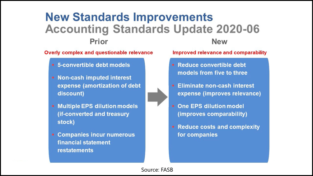 - One member, echoing others, said 0% coupons and conversion premiums in the range of 50% to 70%, along with updated FASB accounting standards (see chart) that could simplify the process, make convertible bonds “more attractive, but it’s an odd gamble when rates [for straight debt] are below 3%.”