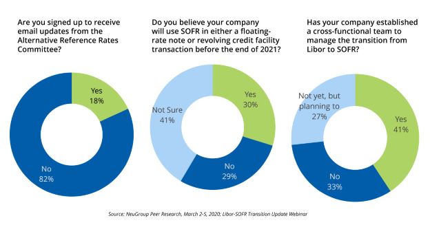 Some NeuGroup corporate members—nonfinancial institutions—are well on track with planning to transition off Libor before the end of 2021. One company, Ford Motor, has even joined the Alternative Reference Rates Committee (ARRC), a group of private-sector participants convened by the Federal Reserve Board and the New York Fed to help identify alternatives to Libor and develop strategies to promote their use. However, the majority of members have work to do, as revealed by polling on two conference calls last week with David Bowman, the Fed’s senior staff liaison to the ARRC. Altogether, we had 184 member participants from 91 companies on these calls.