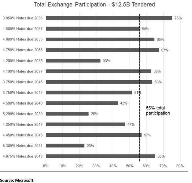 Liability management success: Microsoft received exchange interest of $12.5B, 56% of the targeted notional amount.