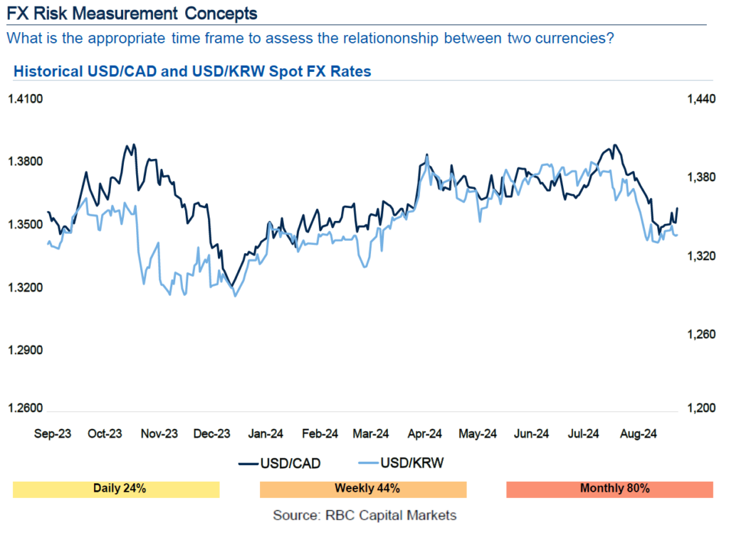 - In the below comparison of USD/CAD and USD/KRW, Mr. Yao asserts that most would assume this pair is very highly correlated at first glance. But at a daily return interval, the pair is only correlated at 24%—a very low correlation.