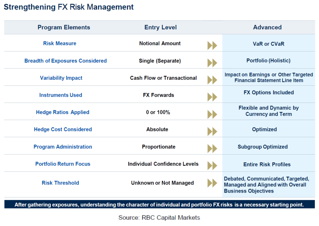 - The table below illustrates how teams can level up their FX programs with advanced risk concepts.