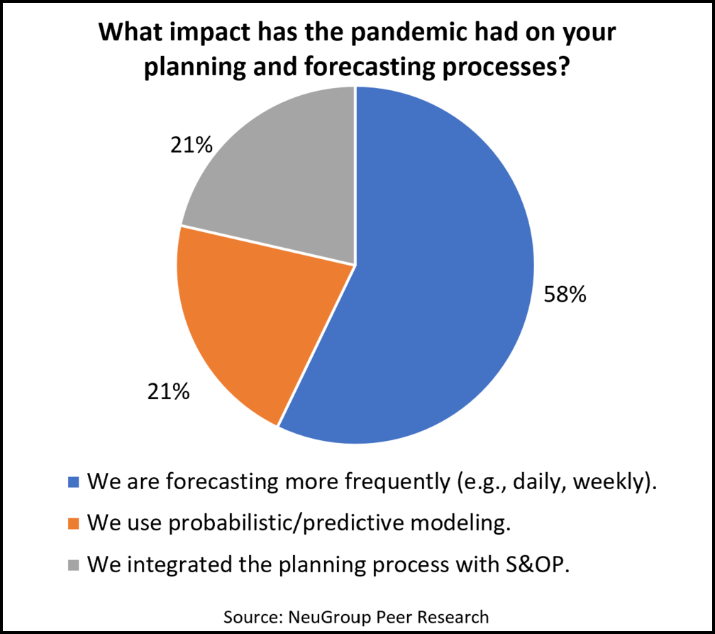• One member shared about the impact on forecasting of a supply chain issue related to shipping products on international flights, many of which were cancelled due to the pandemic. As a result, the company has made its forecasting more agile to be ready for future potential disruptions.