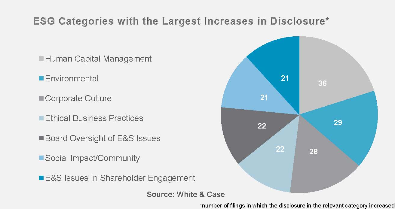 Human capital. First on the list is likely to be human capital management statements, where the SEC has offered specific guidance (90% of companies surveyed make disclosures on this and 70% increased them). Also important: