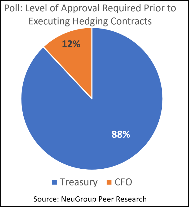 Peer answer 2: “For balance sheet hedges and cash flow hedges, the treasurer approves the trades. The assistant treasurer, or a delegate, approves true-ups.