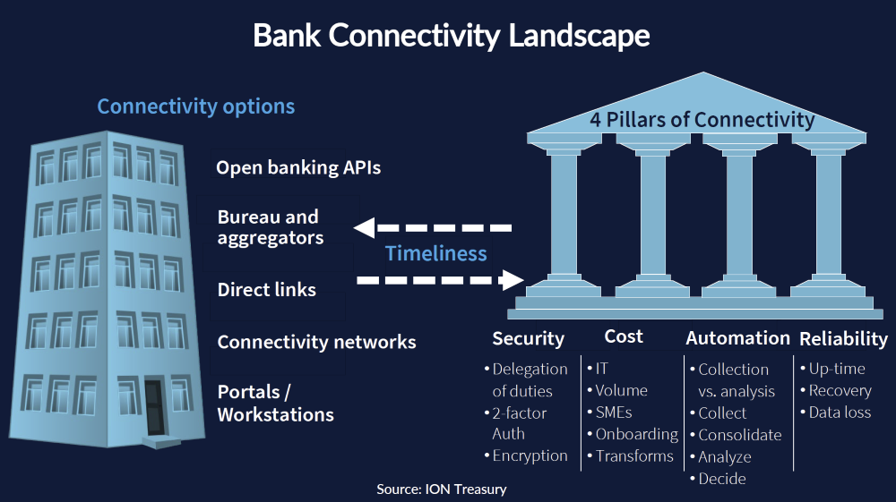 - As ION noted, the bank connectivity part of APIs is all about timeliness and improving the security, cost, automation and reliability of connections (the four pillars of connectivity—see chart) between banks and corporate treasuries.
