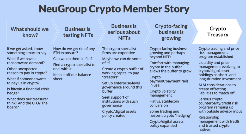 NFTs: Gateway drug to crypto? The table above is a distillation of the crypto storyline for some NeuGroup member companies. It starts with a desire to have an informed answer if asked about the topic. How far beyond the middle stage member companies progress, as we emerge from the current downcycle, will depend on the business case for crypto, which often starts with NFTs. At the end state, crypto expertise (including DeFi and Web3) will integrate into treasury’s complete range of specialized knowledge, or a crypto treasury center of excellence may emerge as a standalone. This crypto COE, not unlike a captive finance company, would collaborate with the traditional finance treasury yet maintain a distinct team and, perhaps, entity structure.