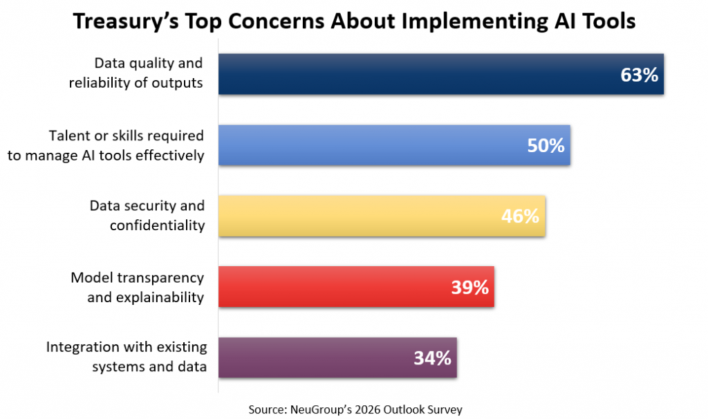 - That growing focus on AI helps explain why data is one of treasury’s most pressing issues heading into 2026. In a question on overall obstacles to achieving treasury objectives, 57% of respondents cited a lack of access to a single, consistent source of data, making it the second-most common obstacle overall—an issue that also ranks as members’ top concern around implementing AI tools (see chart below).