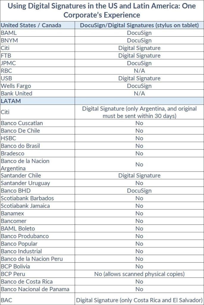 - The takeaway is that corporates should keep applying pressure to financial institutions and regulators to allow broad use of digital signatures across the globe.