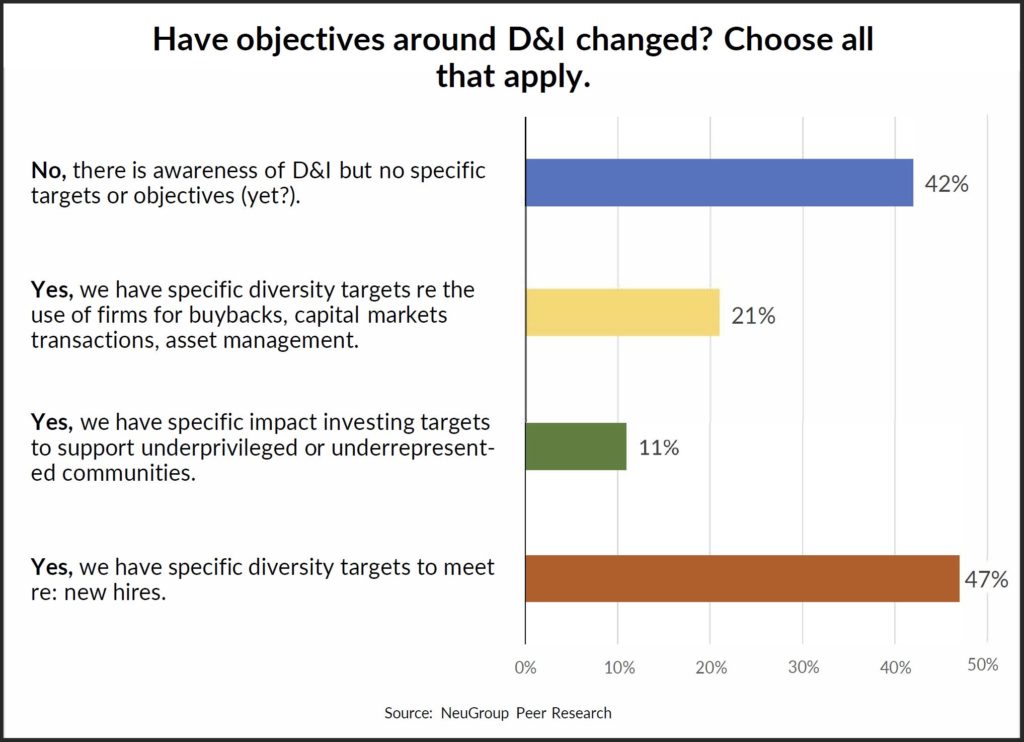 Context on targets. Before the member’s presentation, attendees were polled on whether treasury has specific targets to meet D&I objectives. As the chart below shows, only five percentage points separated those companies with targets (47%) from those without (42%).