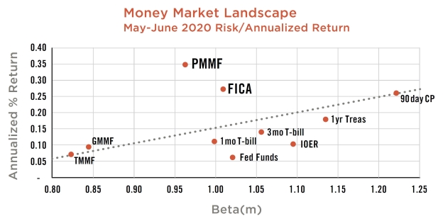 • As the chart shows, prime money market funds (PMMF) and Federally Insured Cash Accounts (FICA) appeared above the beta line of one-month Treasury bills from May to June of 2020.