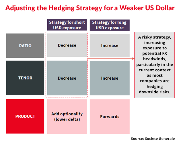 More optionality. Societe Generale is recommending that corporates with short dollar positions incorporate more options into their product mix to capture upside from cash flows converted back to a weaker dollar with limited incremental volatility.