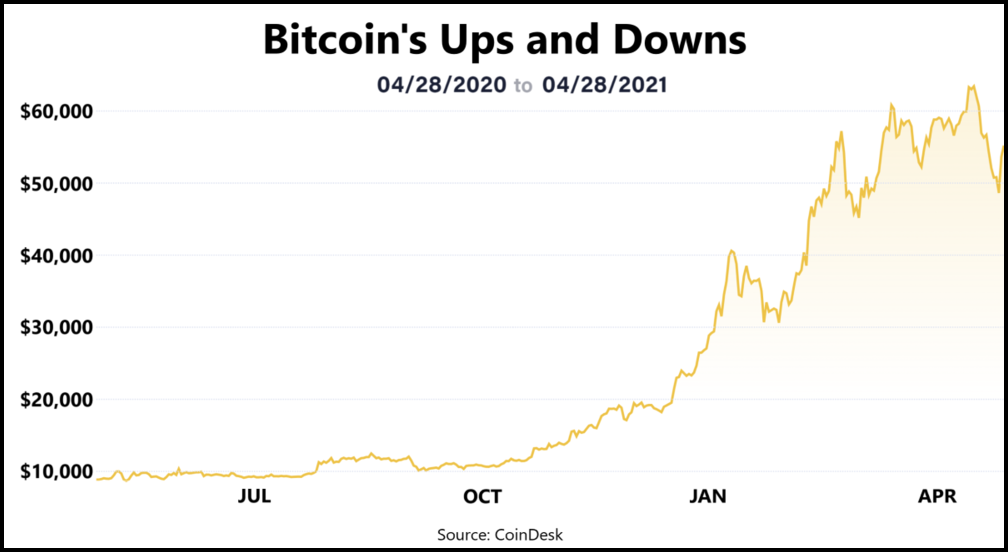 • As long as private digital currencies such as Bitcoin and Ethereum remain very volatile—as the chart shows, bitcoin has fallen more than 20% since mid-April but increased in value by more than six times over the last year—they will be unattractive as a form of payment. And so, members agreed, customers, advertisers and others are not yet “clamoring” to accept them.