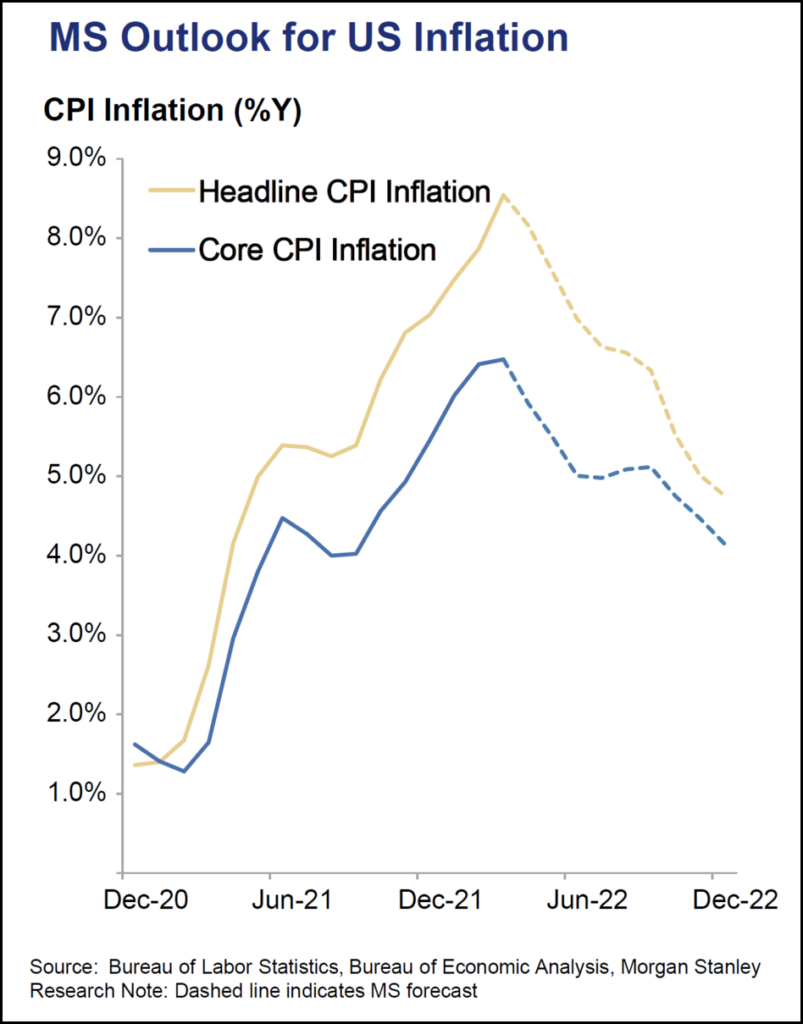- While slowing over the course of this year, Morgan Stanley expects that real GDP growth will remain above trend, with continued strong wage and job growth supporting consumption together with some lift from fiscal policy as infrastructure spending kicks into higher gear from the fourth quarter of 2022 onward.
