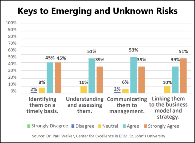 Keys to success. Doing a good job discerning those risks (and opportunities) will mean success for the company, according to Paul Walker, the James J. Schiro/Zurich Chair in Enterprise Risk Management and Executive Director of St. John’s University’s Center for Excellence in ERM. - Dr. Walker, who presented at a NeuGroup for Enterprise Risk Management meeting in April, said a recent survey he conducted showed that 94% of respondents agreed that “how well an organization anticipates, interprets and reacts to emerging risks, market changes, trends and disruption is the key to future success,” according to a white paper by Dr. Walker.