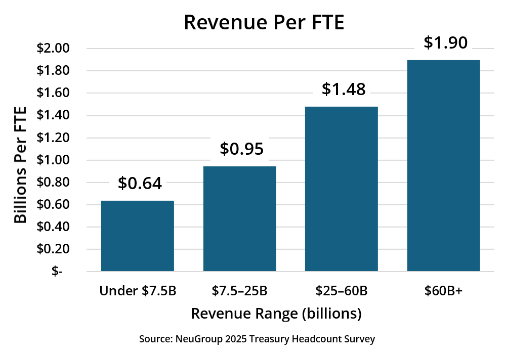 Treasury teams at larger companies support significantly more revenue per person, suggesting that efficiency improves as companies scale.